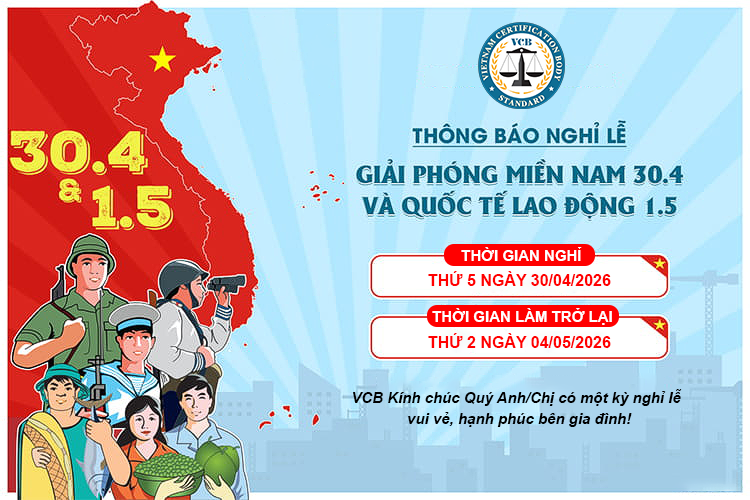 Nhân dịp kỷ niệm ngày thống nhất đất nước (30/4) và Quốc tế Lao động (1/5), Công ty CP Chứng Nhận Việt Nam xin trân trọng thông báo đến Quý Anh/Chị lịch nghỉ lễ như sau: